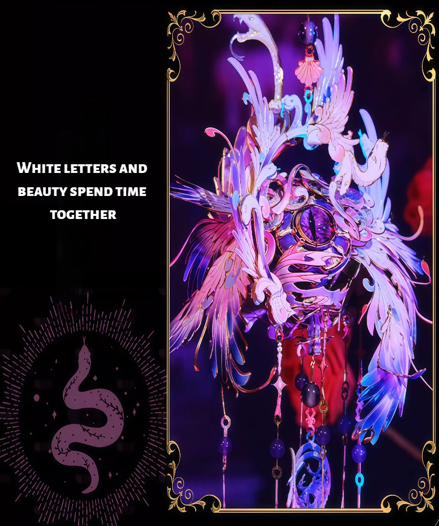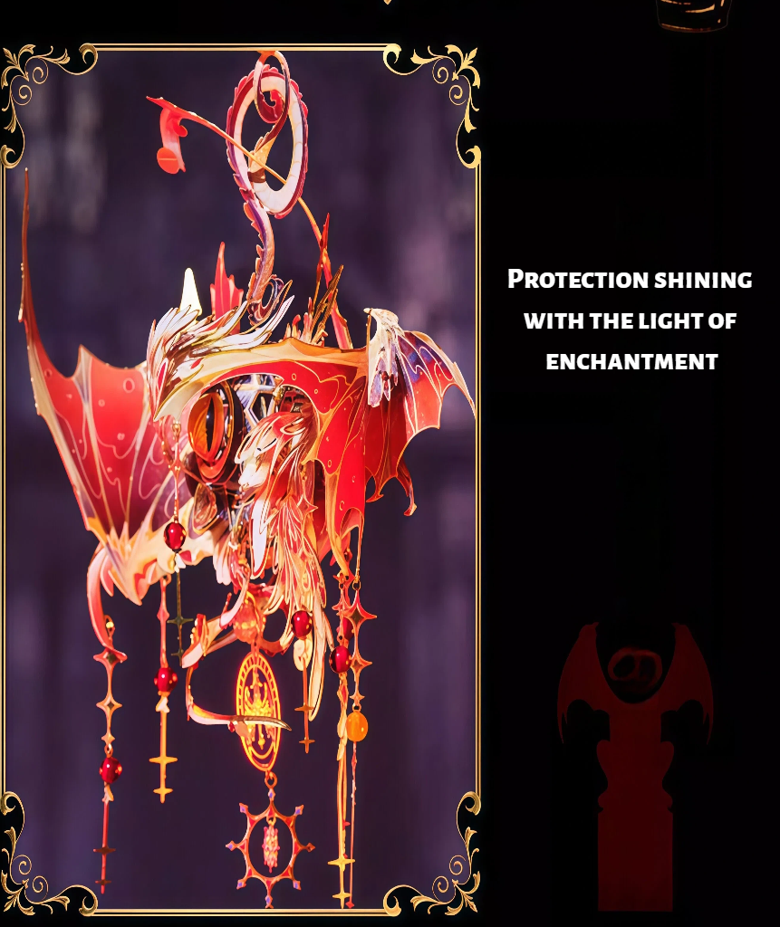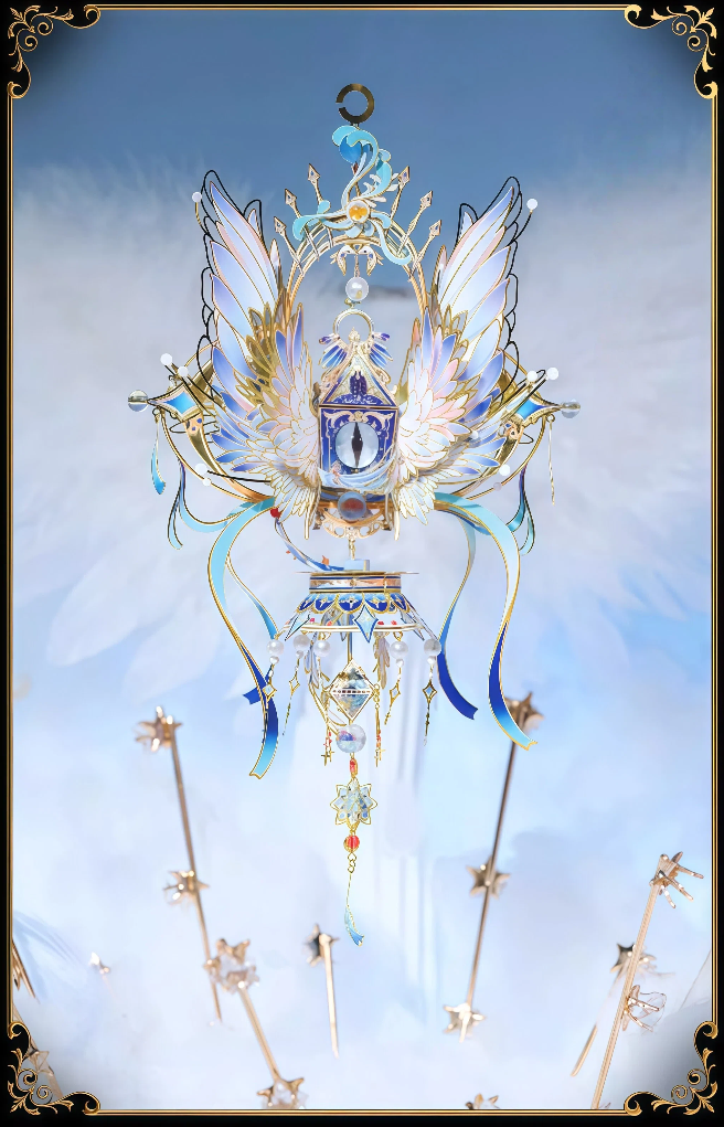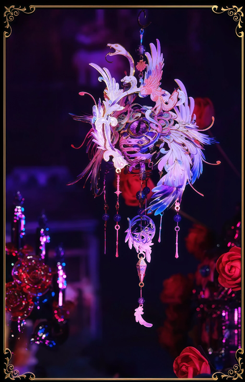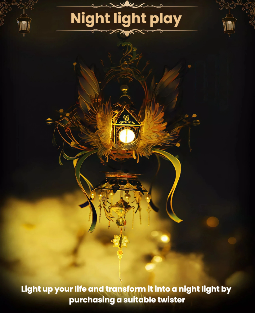 This item is a decorative piece named "Night Light Play" — a stylized lantern-adorned ornament with ornate, wing-like designs and hanging accessories. It functions as both an artistic decor (featuring elaborate, glowing golden craftsmanship) and a convertible night light: by adding a compatible twister component, it can emit warm light to illuminate spaces.