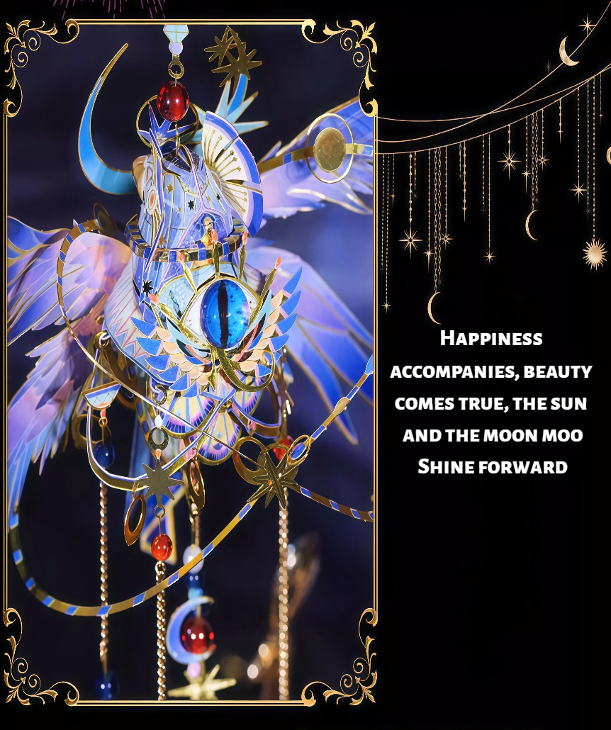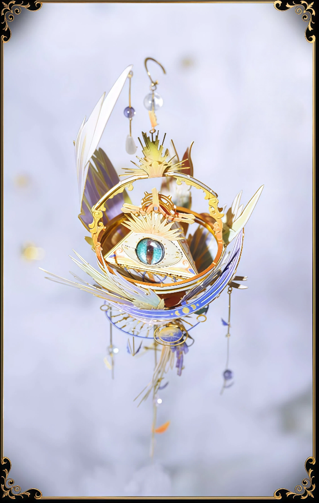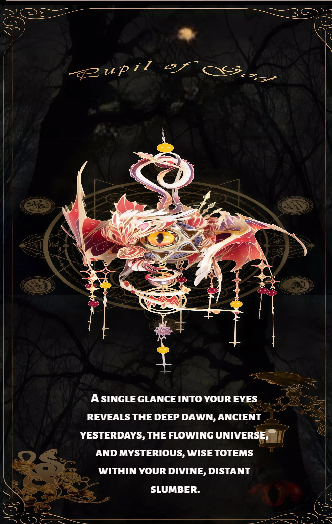 Its design and accompanying text frame the eye as a "divine window": a single glance through it is said to reveal deep dawn, ancient memories, the flowing universe, and wise totems—infusing the piece with an aura of otherworldly mystery and wisdom. It functions as an artistic ornament that carries symbolic, atmospheric depth.