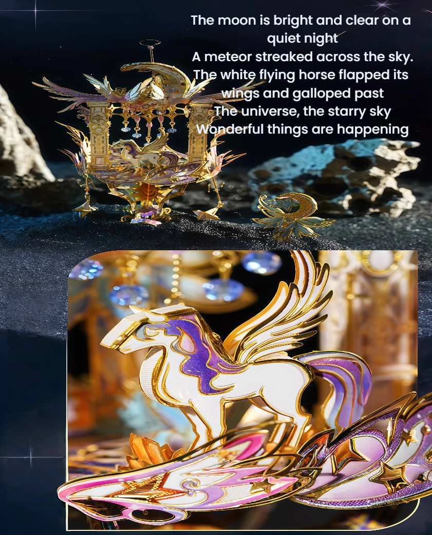 - It integrates elements such as the moon (representing the night), flowers (representing beauty), stars (representing the universe), paired with the shape of a winged flying horse, conveying a romantic and fantasy atmosphere;