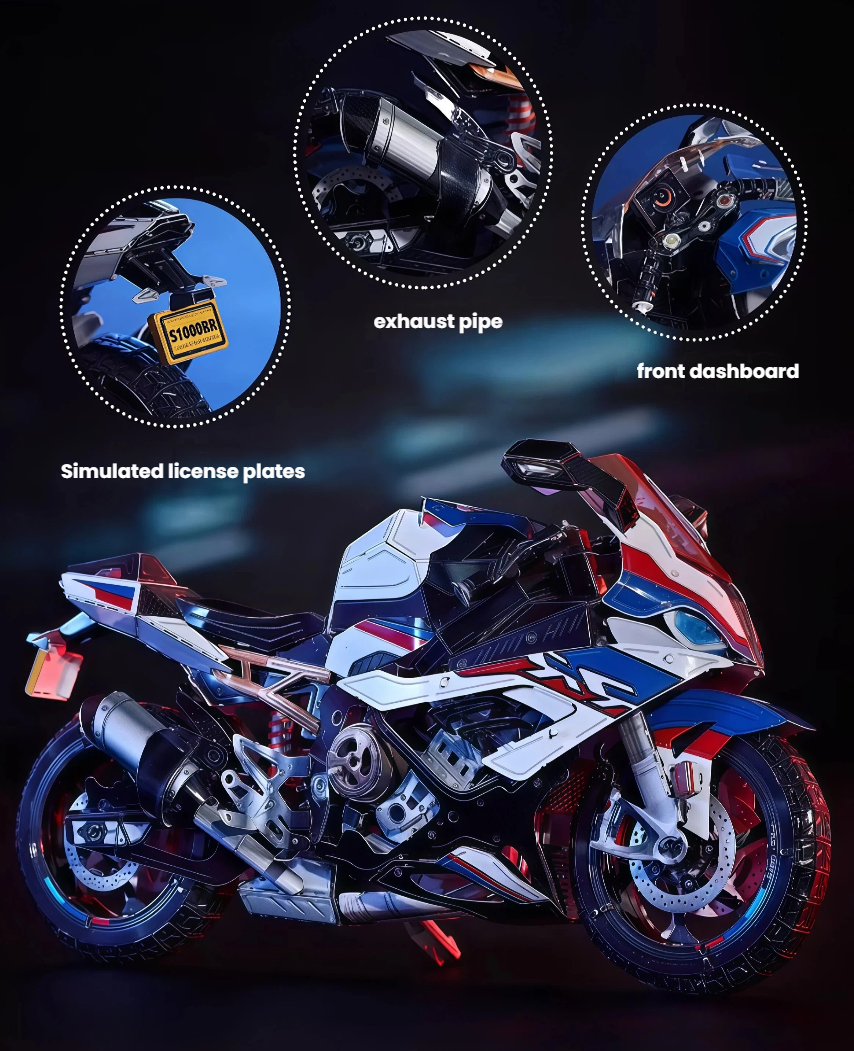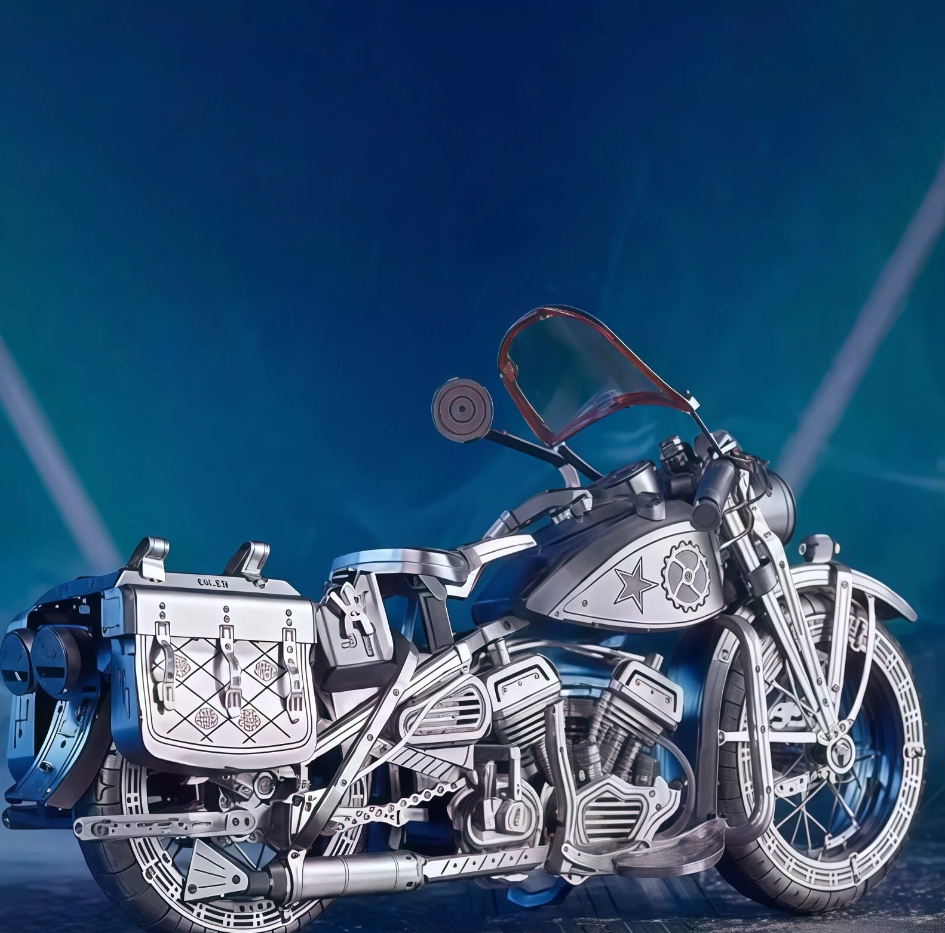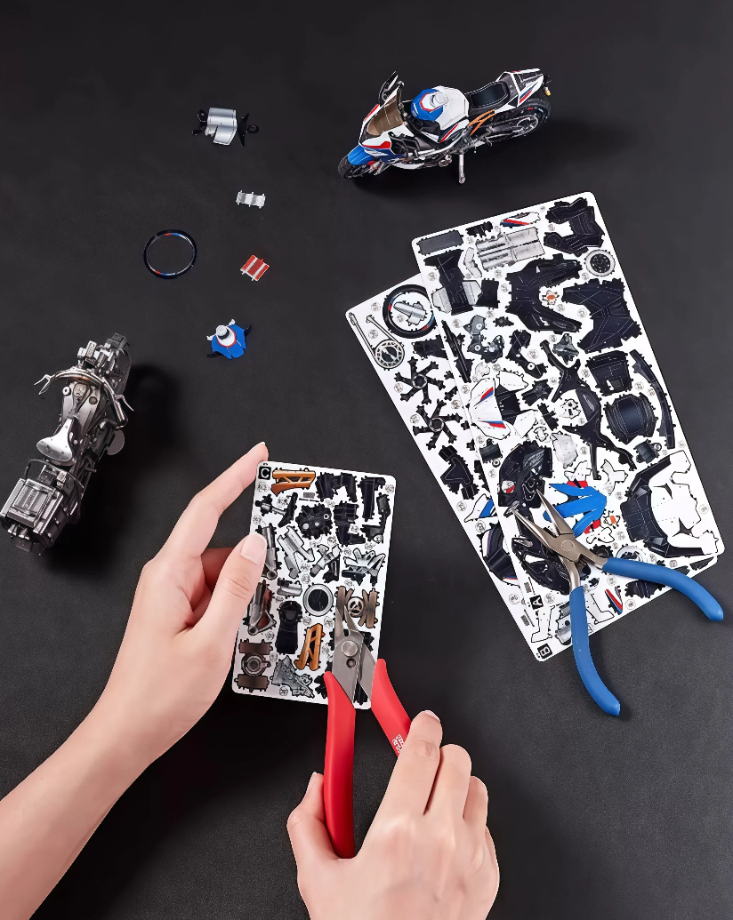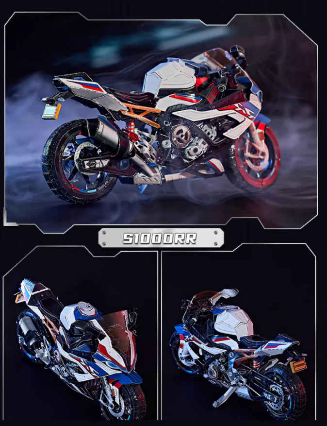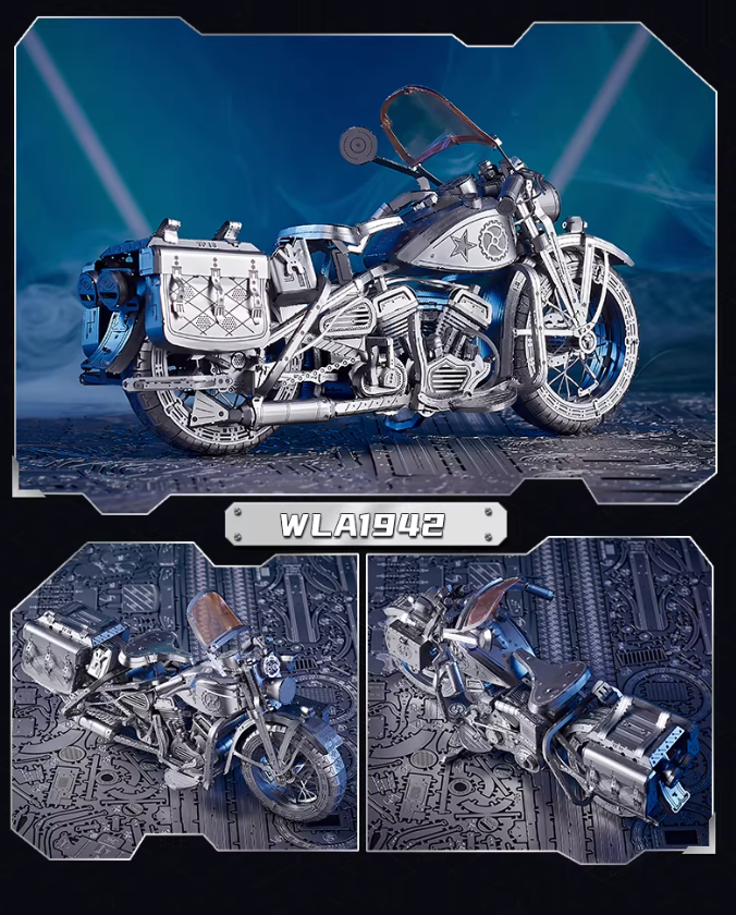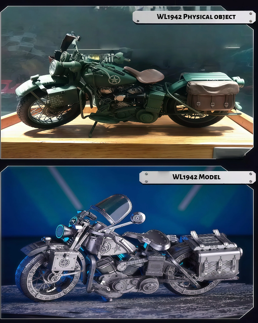 These are two metal assembly models: one based on the high-performance BMW S1000RR road racing motorcycle, which lets enthusiasts enjoy DIY fun while creating a detailed decorative piece, and the other based on the WWII-era classic military retro Harley WLA1942 motorcycle, a handmade DIY ornament that recreates the retro mechanical style with collectible and decorative value.