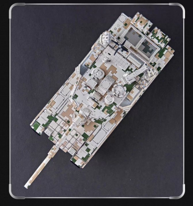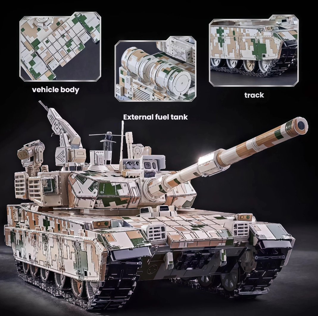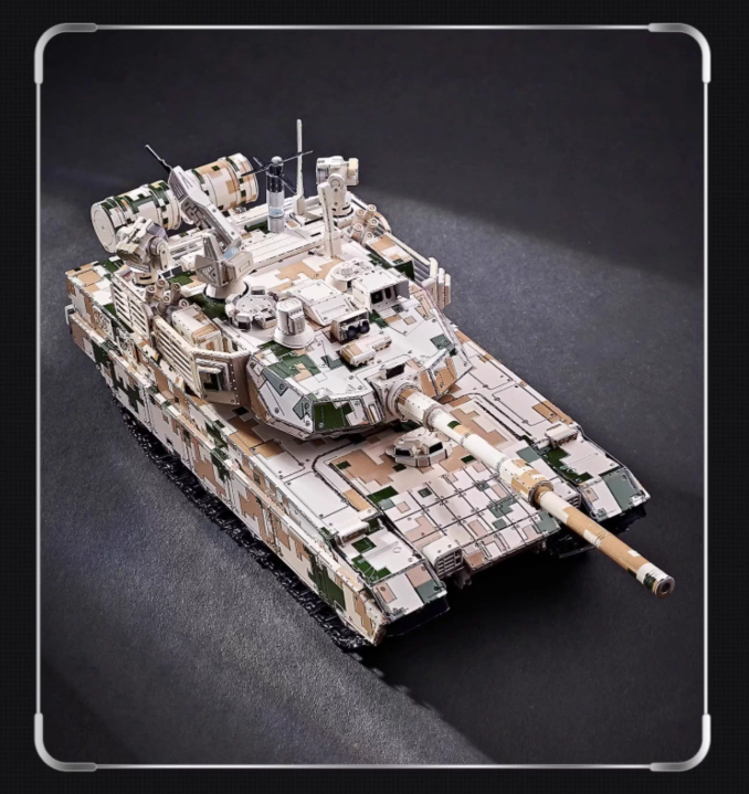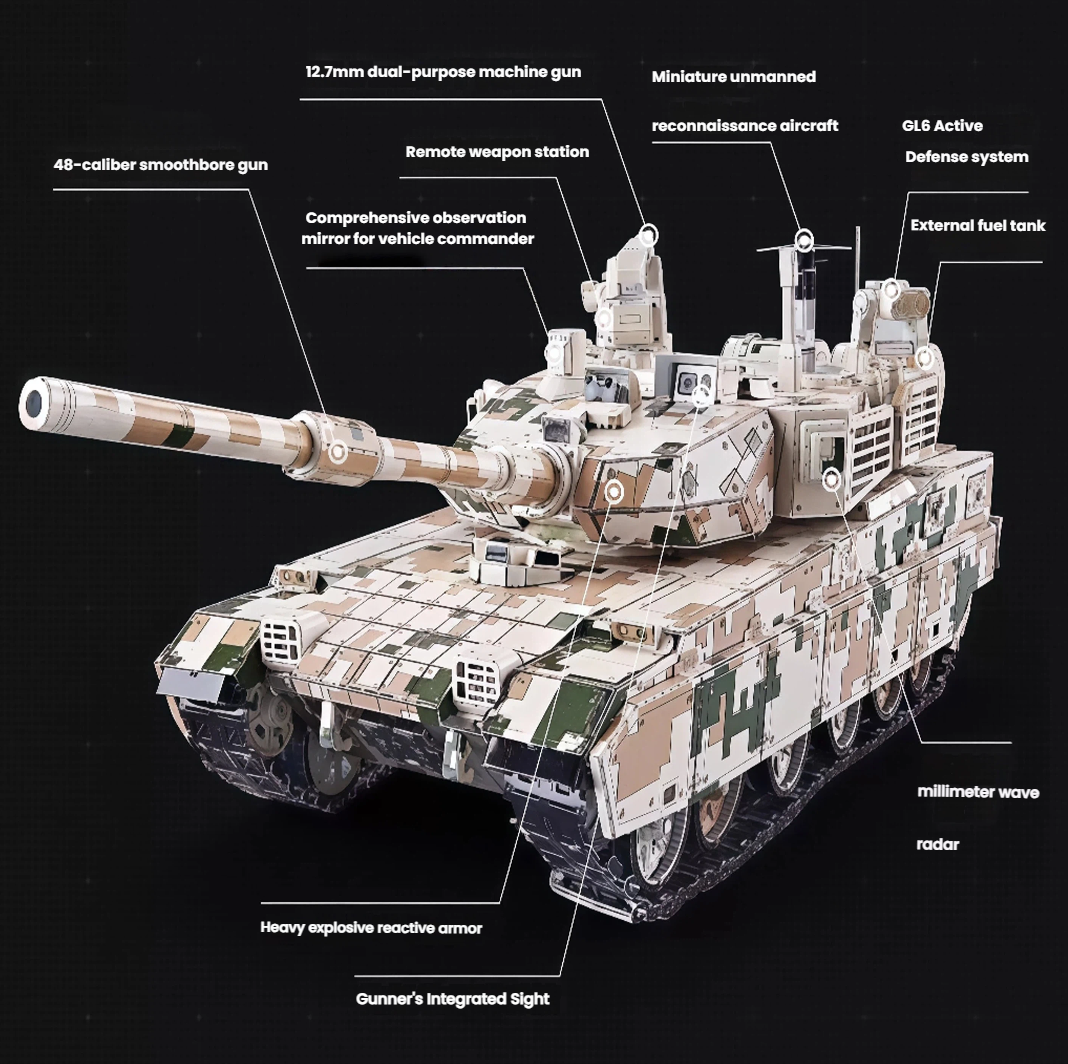 This is a desert-camouflage tank model with high simulation details. It reproduces components like a 48-caliber smoothbore gun, 12.7mm dual-purpose machine gun (mounted on a remote weapon station), heavy explosive reactive armor, and a millimeter-wave radar. It also includes functional parts: the remote weapon station can rotate, the defense system has adjustable angles, the driver’s cab cover is openable, and the rear grille is movable. The miniature unmanned reconnaissance aircraft and GL6 Active Defense system are also restored in the model.