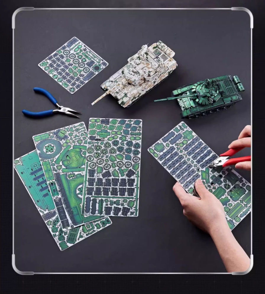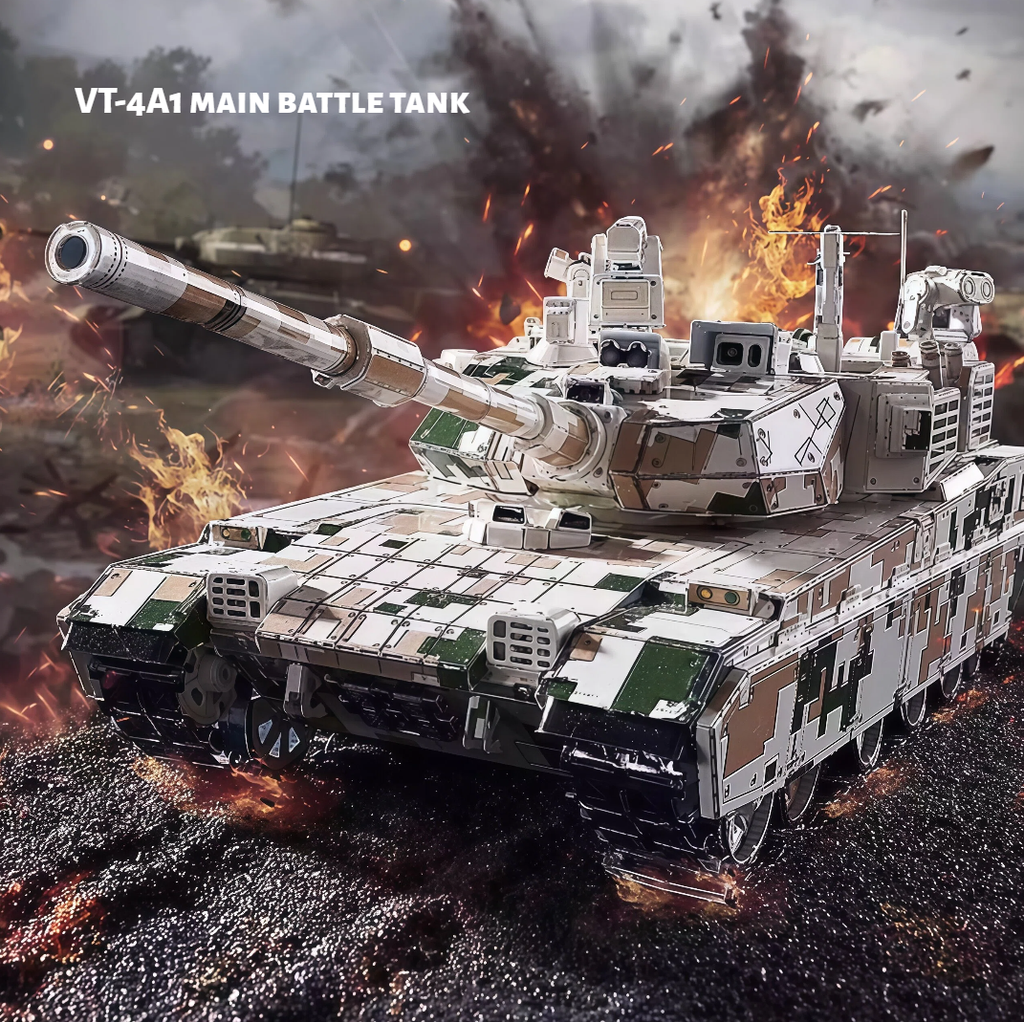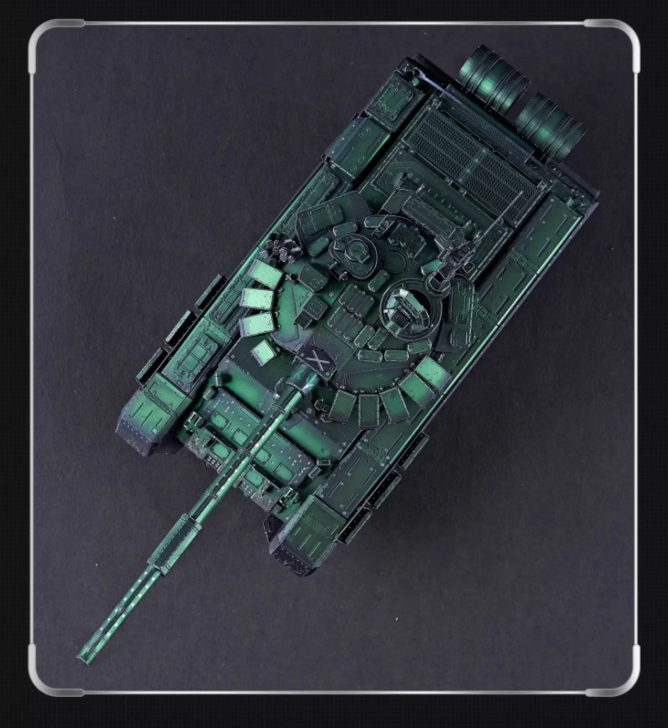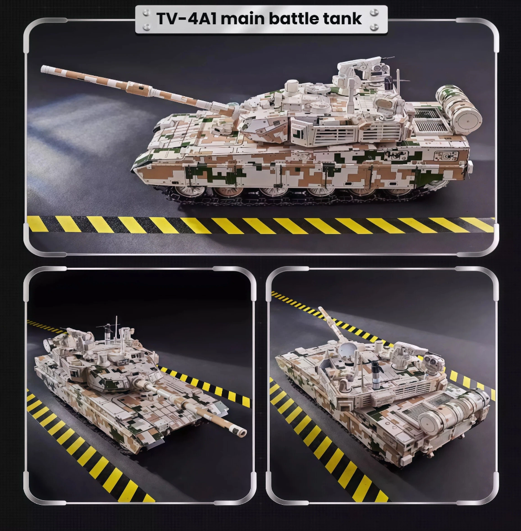 This is a desert-camouflage tank model with high simulation details. It reproduces components like a 48-caliber smoothbore gun, 12.7mm dual-purpose machine gun (mounted on a remote weapon station), heavy explosive reactive armor, and a millimeter-wave radar. It also includes functional parts: the remote weapon station can rotate, the defense system has adjustable angles, the driver’s cab cover is openable, and the rear grille is movable. The miniature unmanned reconnaissance aircraft and GL6 Active Defense system are also restored in the model.