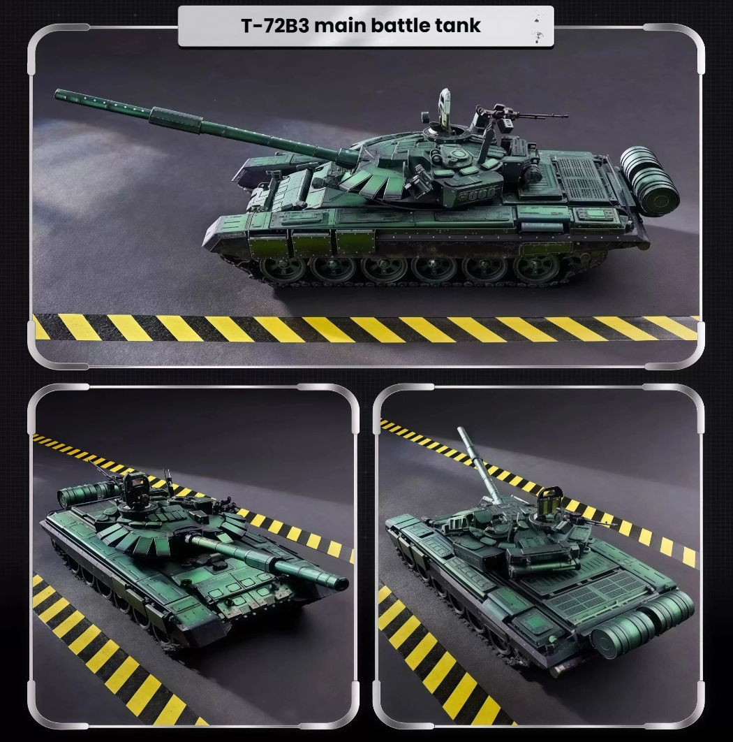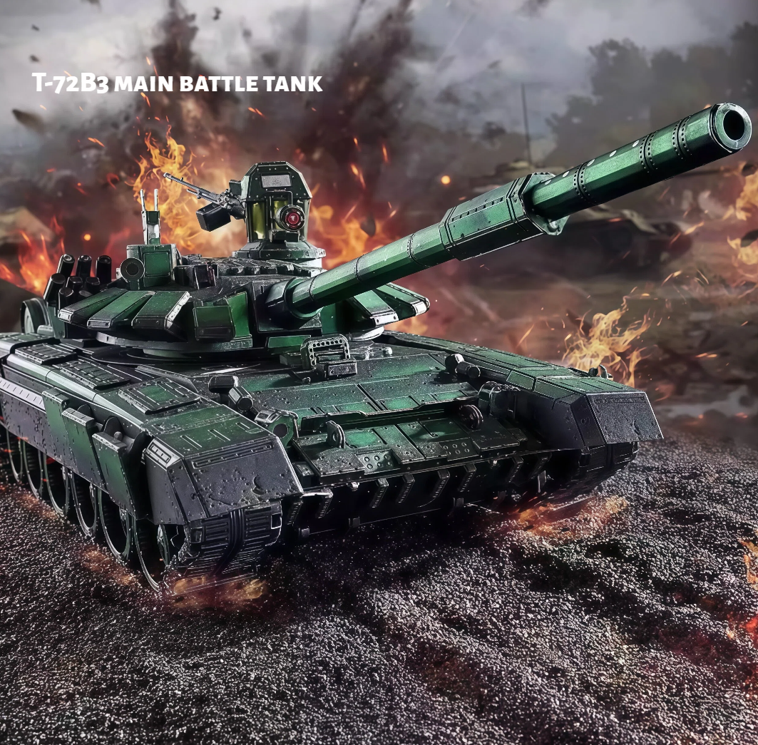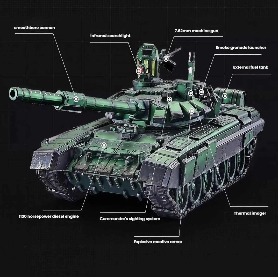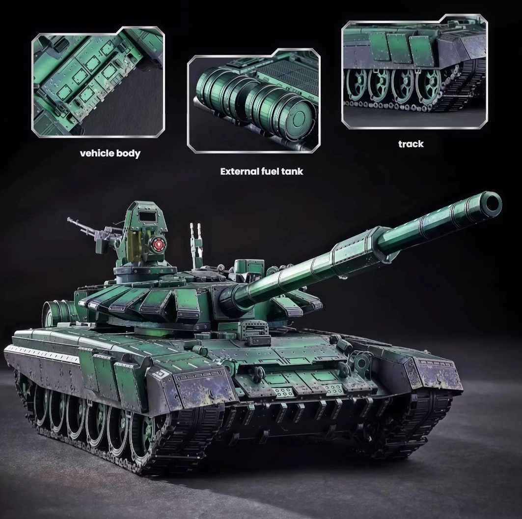 This is a green-painted tank model with realistic details. It features a smoothbore cannon, 7.62mm machine gun (adjustable angle), explosive reactive armor, and a thermal imager. The movable parts include the hatch (openable), the gun barrel (adjustable elevation), and the machine gun mount (rotatable). The model also restores the 1130-horsepower diesel engine structure (external presentation) and smoke grenade launchers.