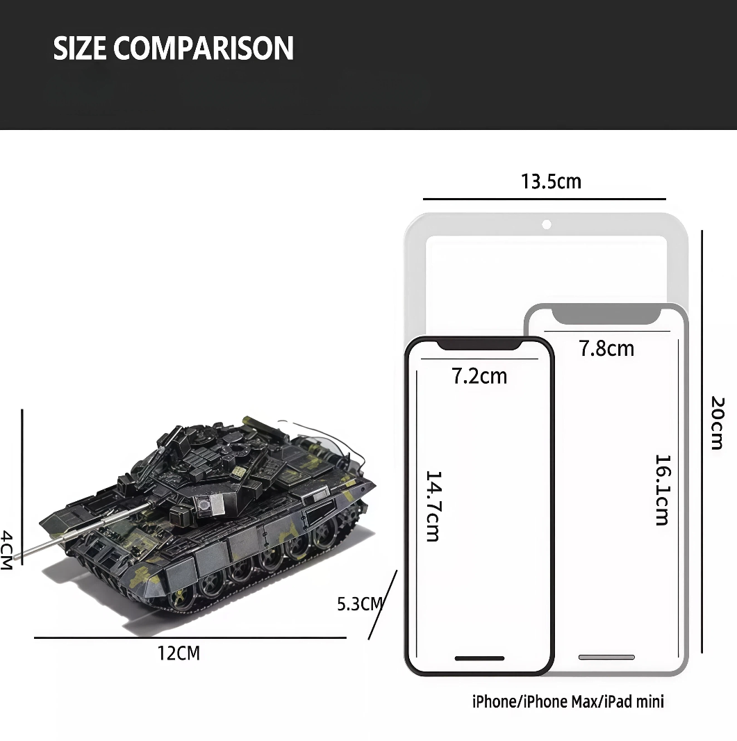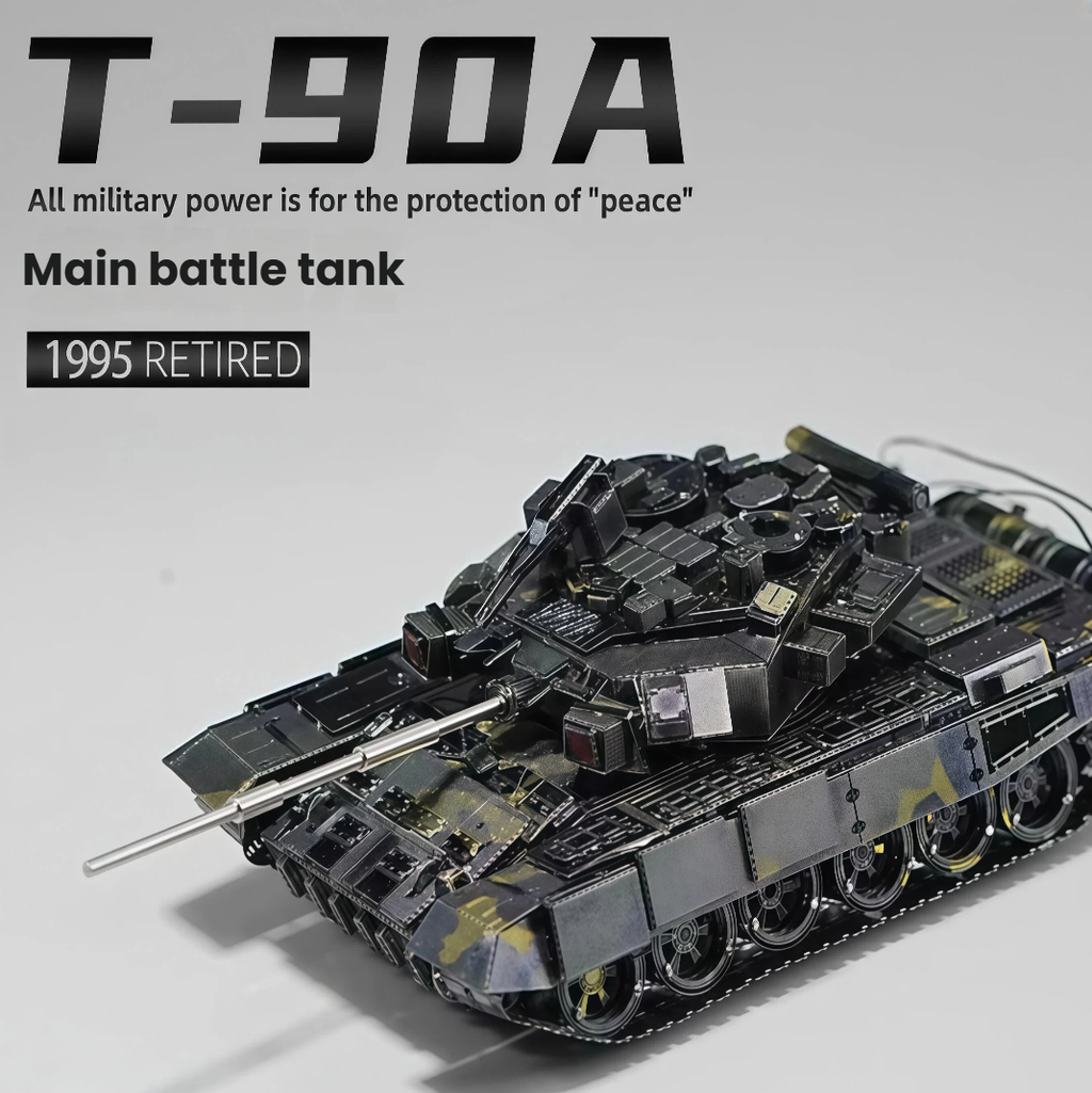 This is a metal assembly model of the T-90A main battle tank, featuring a camouflage paint scheme that replicates the prototype’s exterior details (such as the gun barrel, tracks, and turret components). It is a metal 3D puzzle-style DIY ornament that requires self-assembly, offering both hands-on fun and display/collection value. The background note "1995 RETIRED" (referring to the prototype tank) is also included.