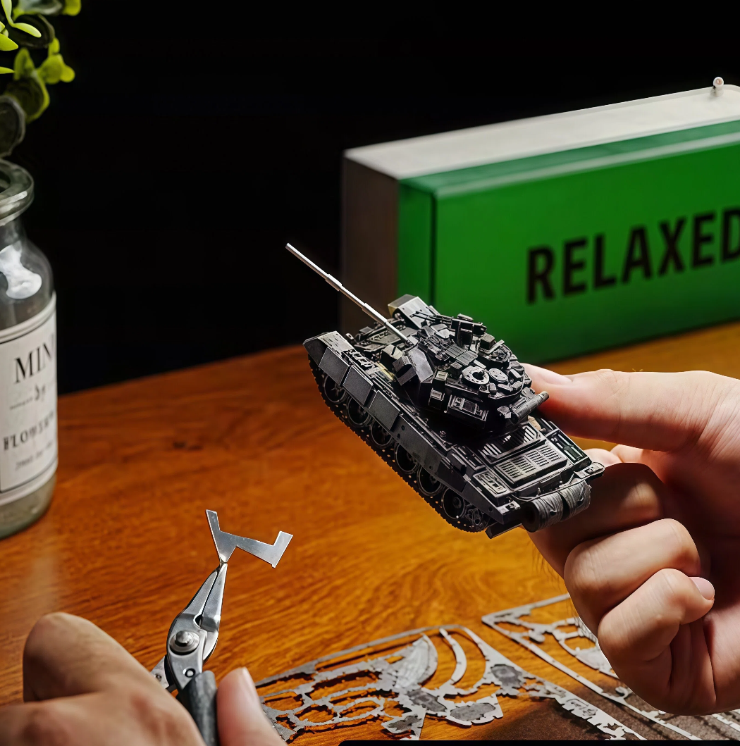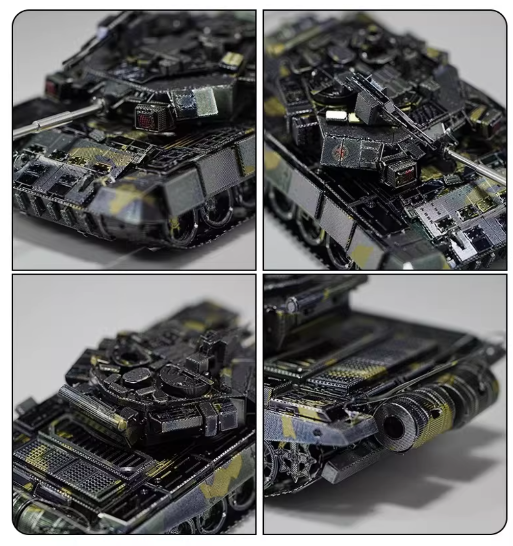 featuring a camouflage finish that highly replicates tank details (such as the gun barrel, tracks, and turret components). It requires using tools like pliers to remove parts from metal sheets and assemble them, offering hands-on fun. The finished product can be used as a display ornament, and an assembly manual is included to assist with the process.
