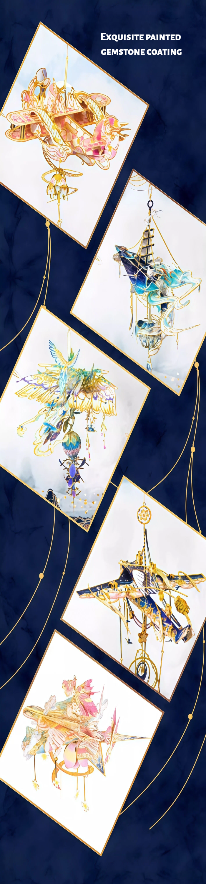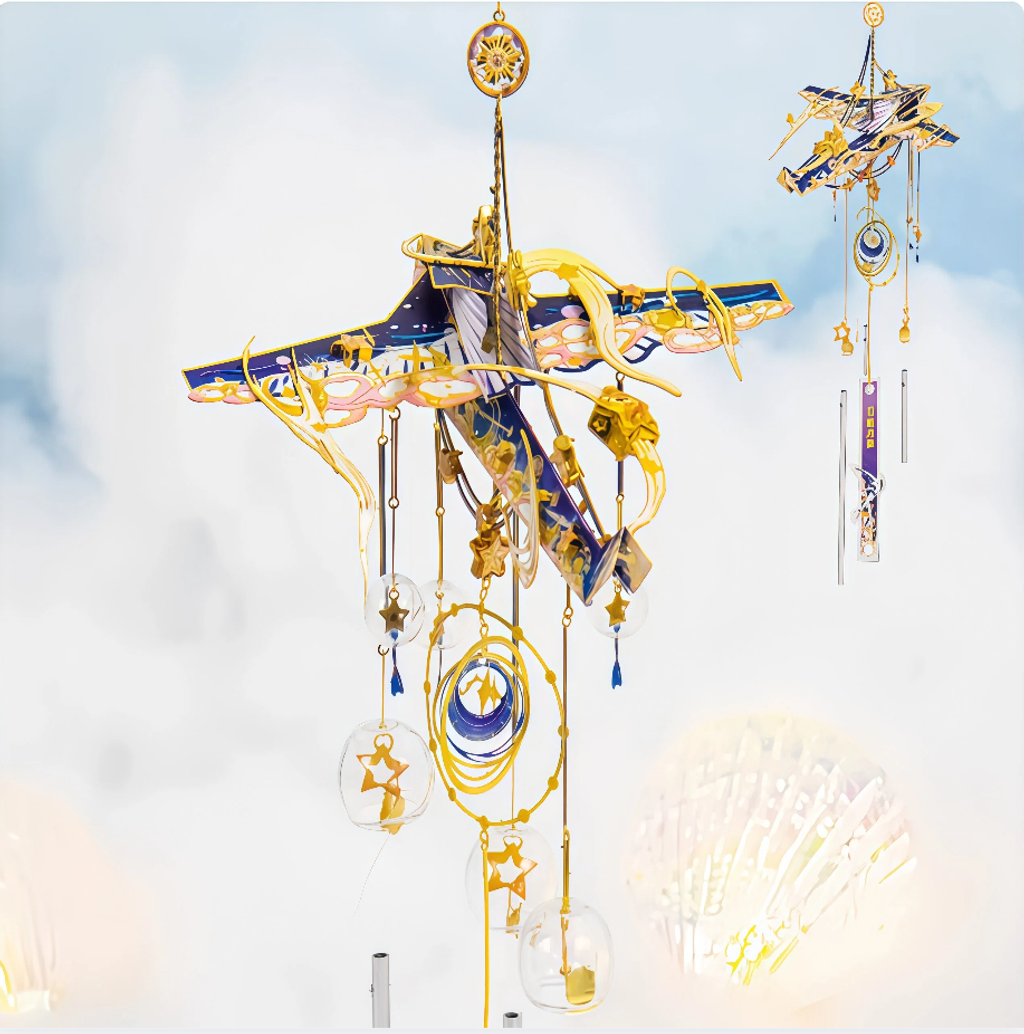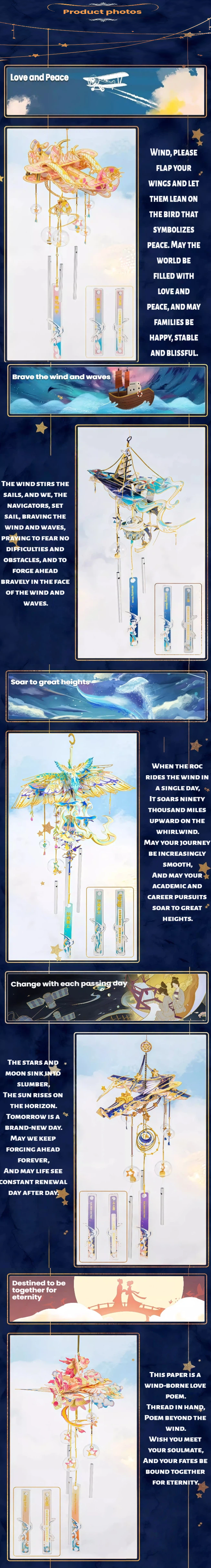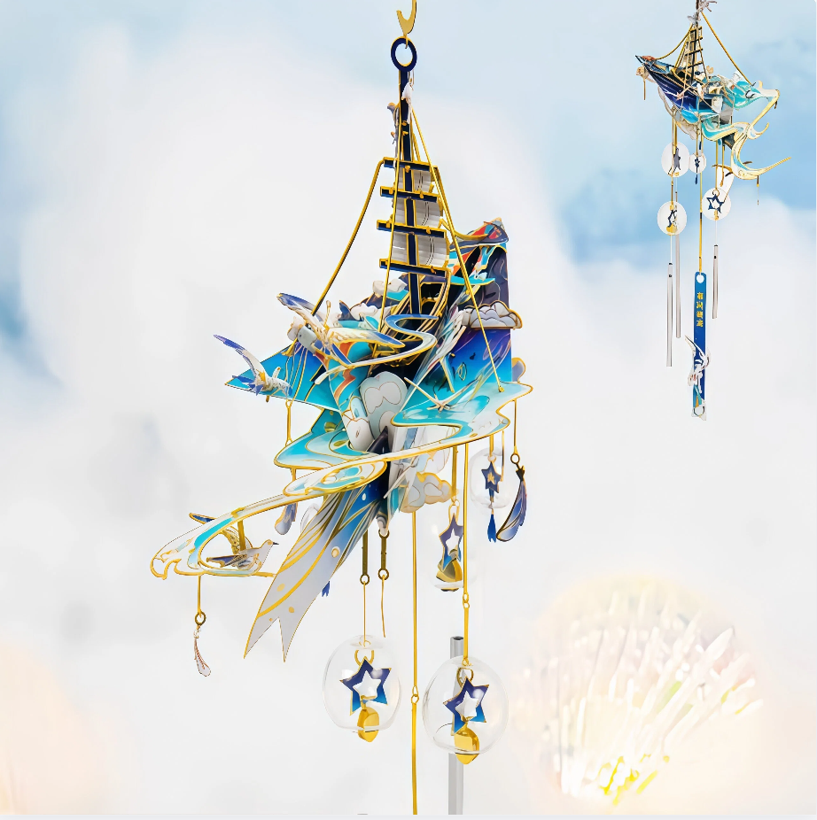 This is a themed wind chime ornament, designed with fantasy elements (such as ship, bird-like shapes) and delicate color & decorative details. It combines decorativeness and ambiance, and can bring a vivid auditory experience when gently swayed.