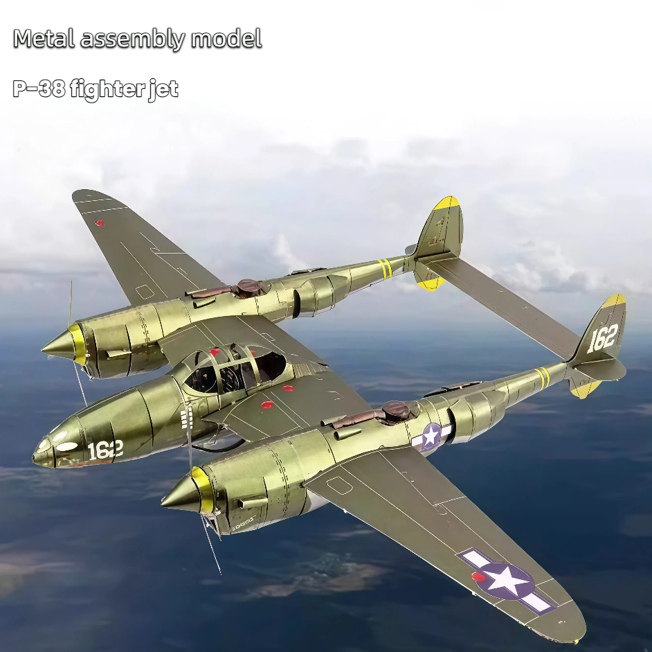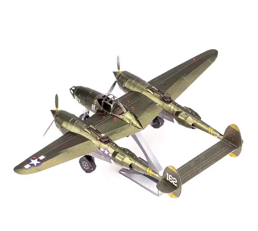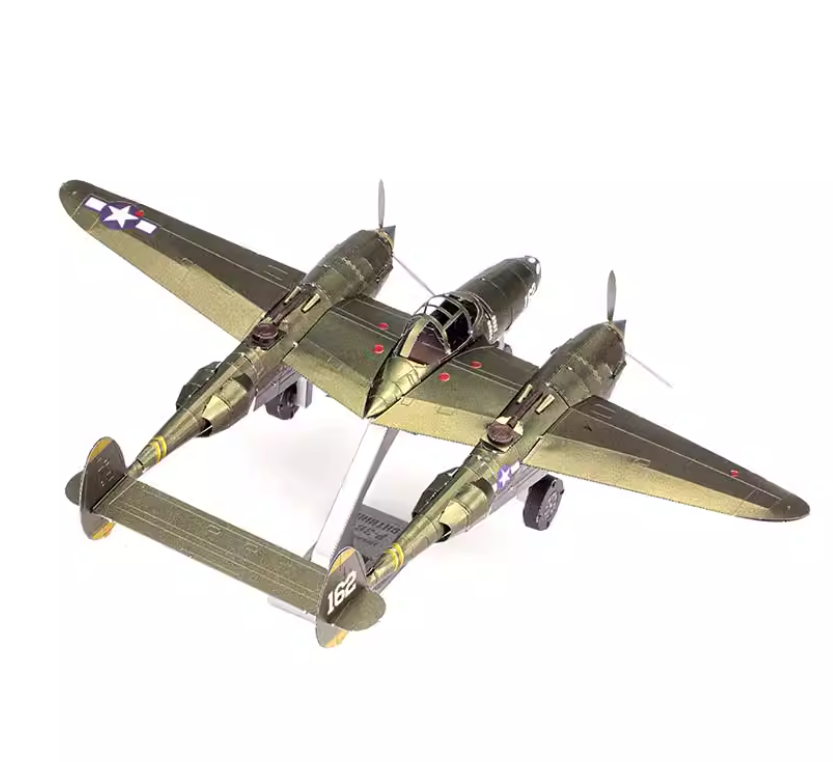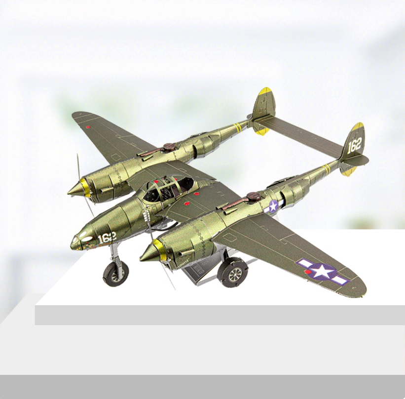 This product is a replicated model of the P-38 "Lightning" twin-engine propeller fighter,based on the classic WWII U.S. military aircraft: it reproduces details such as the olive green paint scheme, U.S. military star insignia, and the number "162",and accurately replicates the iconic twin-fuselage, twin-propeller appearance.