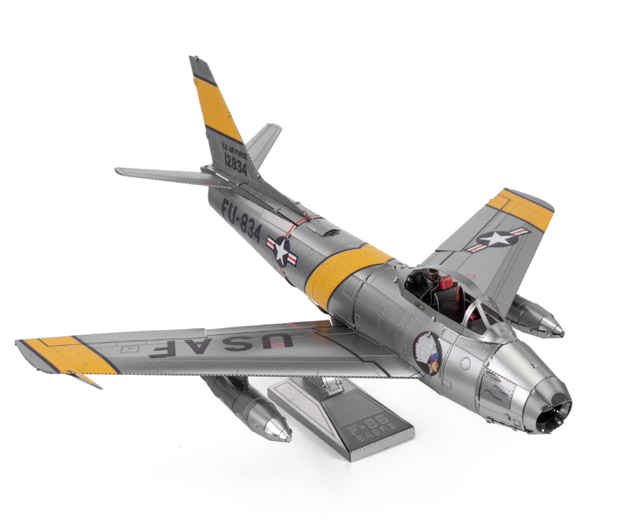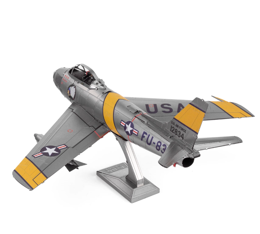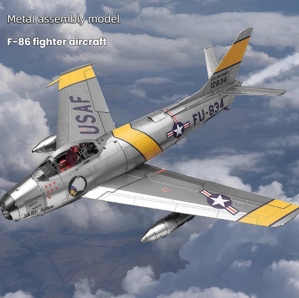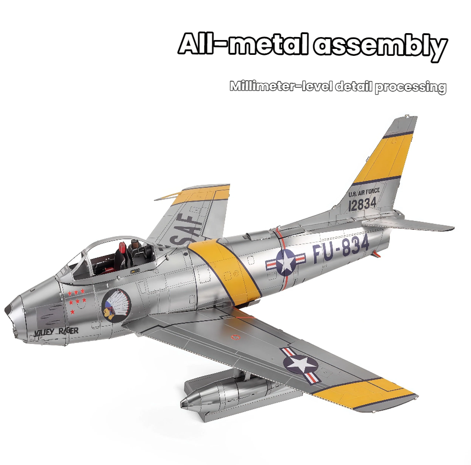 This product is an all-metal model of the F-86 "Sabre" fighter jet, replicated from the classic U.S. military jet fighter: it not only reproduces the appearance details of the real aircraft (such as the silver-yellow paint scheme, U.S. military star insignia, and identification numbers) but also is crafted with all-metal material and millimeter-level precision.