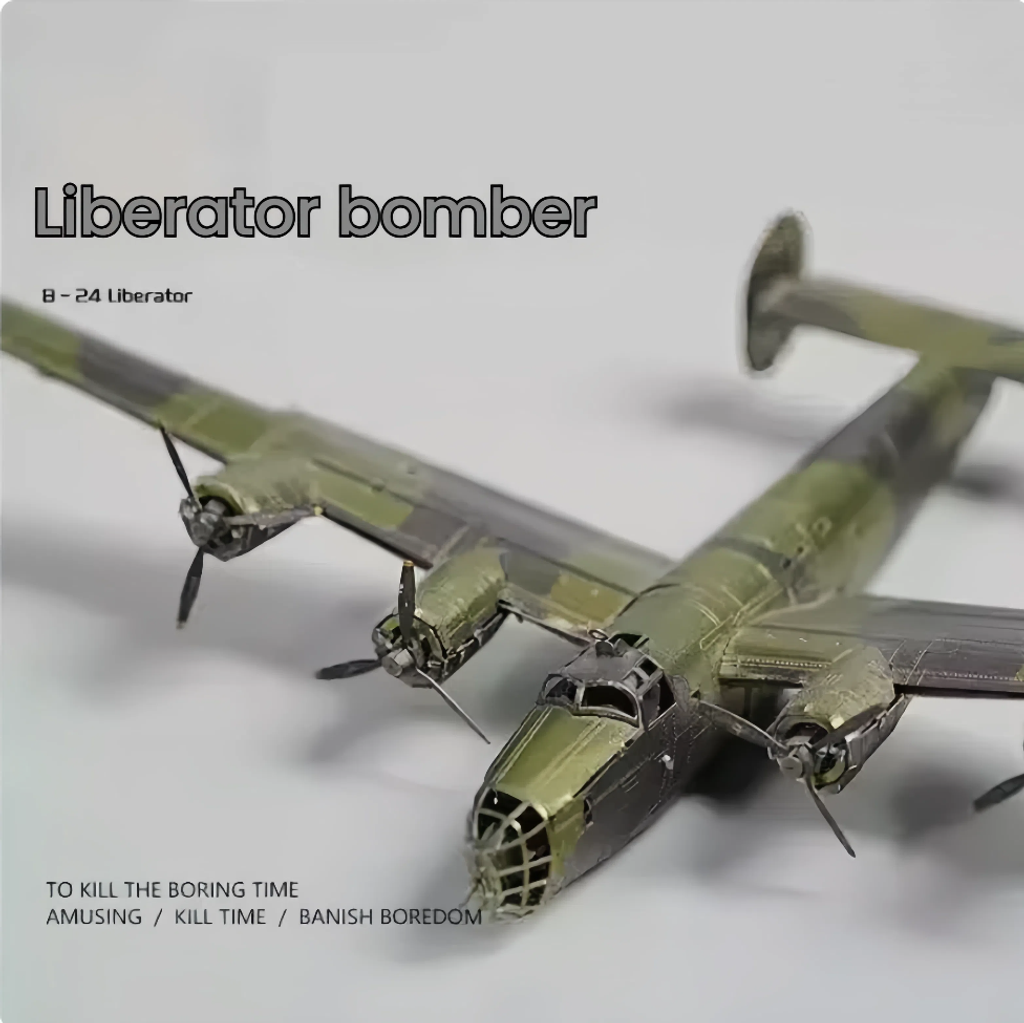 This product is a metal assembly model of the B-24 "Liberator" bomber, based on the classic WWII U.S. military four-engine bomber: It reproduces the olive green camouflage paint scheme, U.S. military star insignia, and the iconic four-propeller appearance. Made of metal with fine craftsmanship to replicate details.