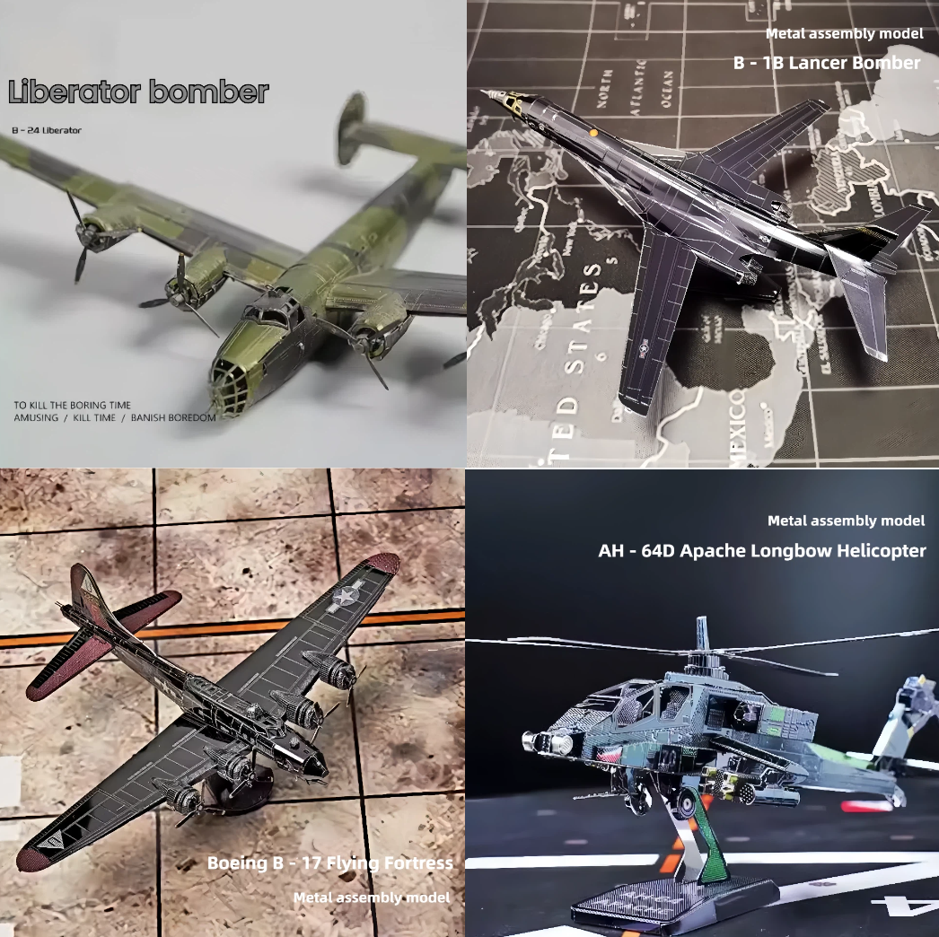 This image showcases 4 types of military air vehicle metal assembly models—a collection/craft product for military enthusiasts: