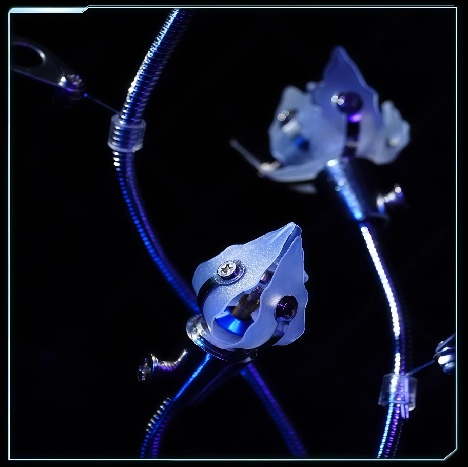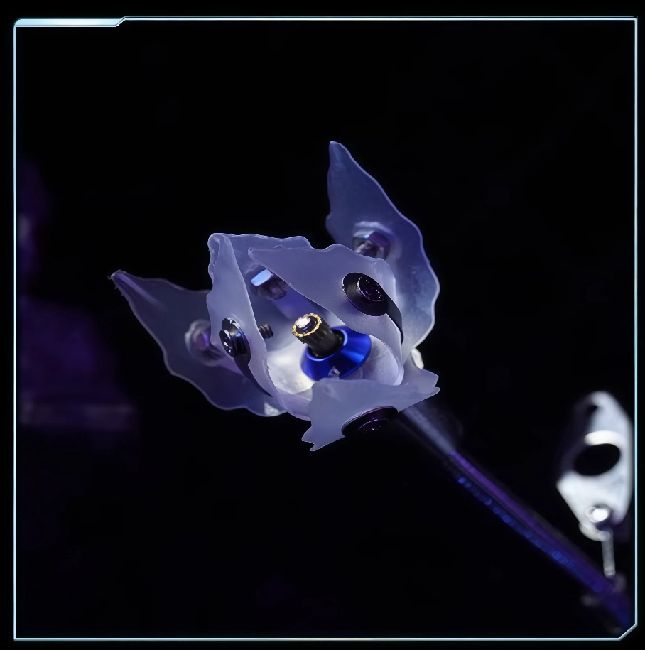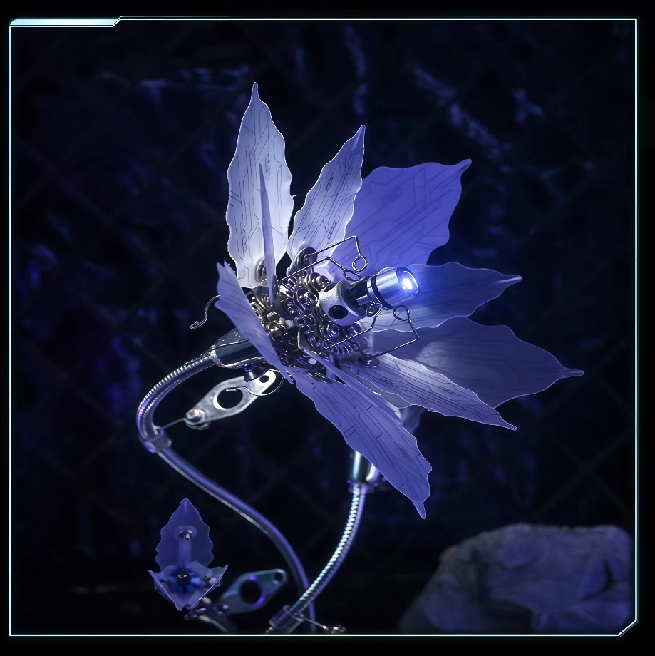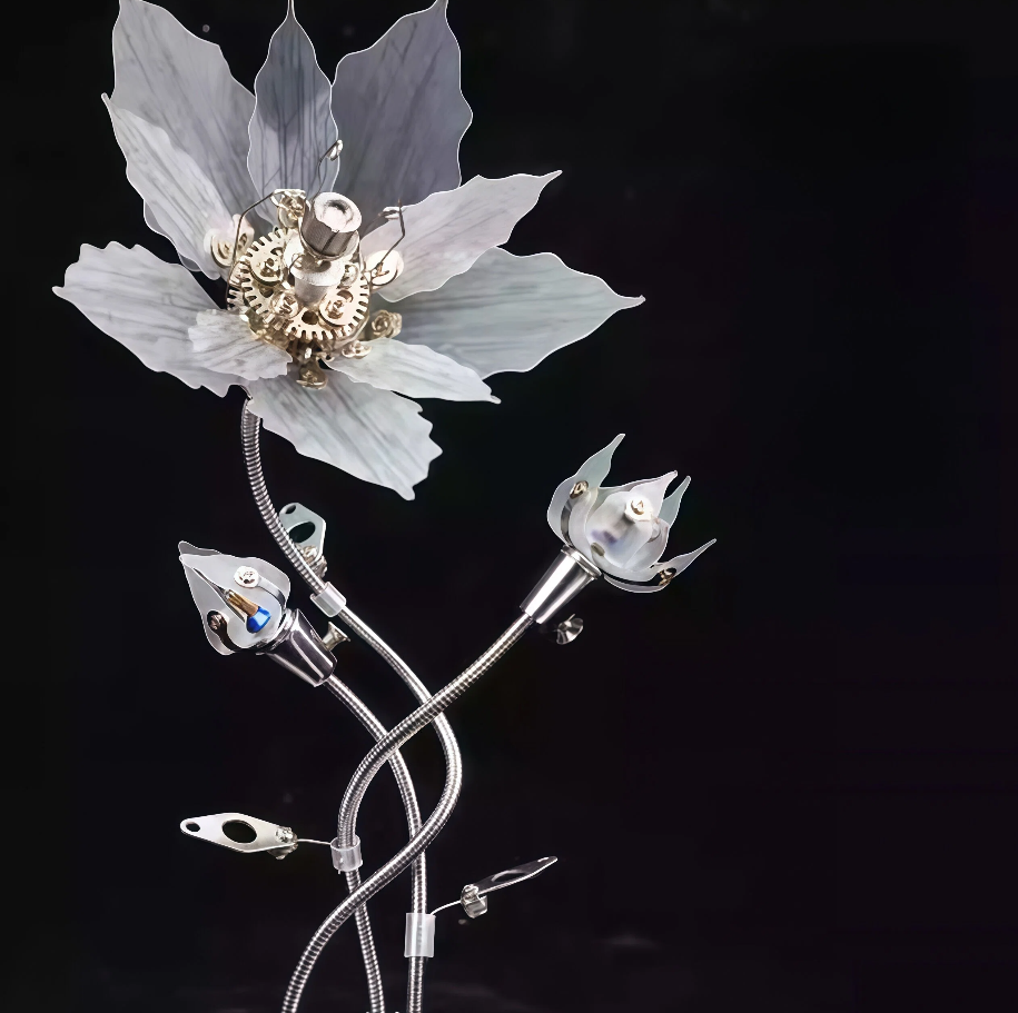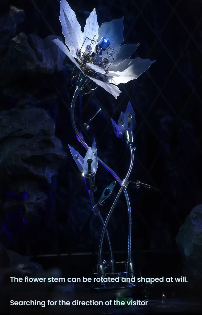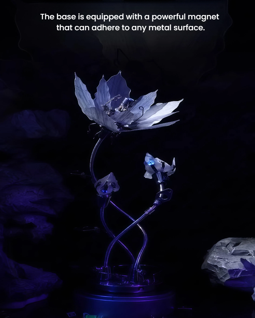 It combines sci-fi mechanical details (like gear structures) with floral shapes: its stem can be freely bent and shaped, the flower center emits a sharp blue light (creating a "dark-breaking" visual effect), and the magnetic base allows it to attach to any metal surface.