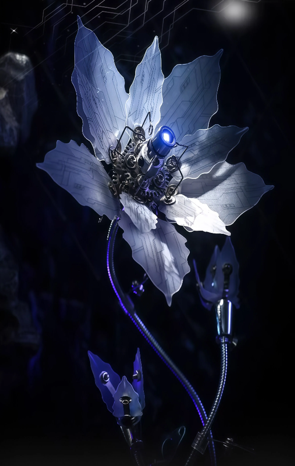 This item is a cyber-mechanical decorative flower that blends futuristic tech aesthetics with floral forms. Its petal design incorporates circuit-like patterns, paired with internal gear structures; the flower center features a luminous module that emits sharp blue light, while the flexible stem allows for free shaping.