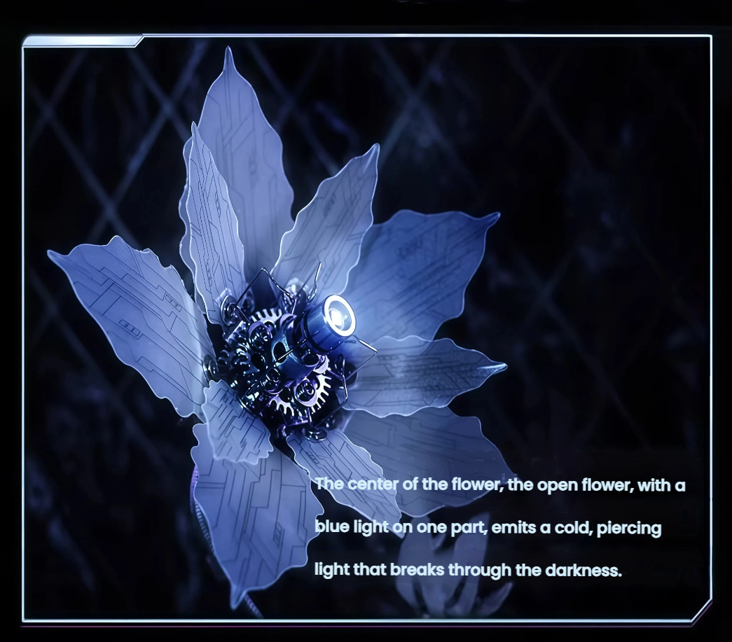It serves as both an artistic ornament (showcasing sci-fi mechanical style) and a functional luminous decor, merging the soft imagery of flowers with the cold texture of machinery to create a unique "tech bloom" vibe.