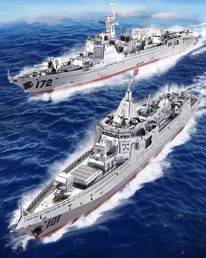 This product is a warship-themed DIY assembly model, a type of 3D decorative piece/toy that requires manual assembly. It is modeled after two distinct types of naval vessels, with the detailed exterior of the ships divided into separate components; users can assemble these parts to create a finished model that closely replicates the shape of the vessels.