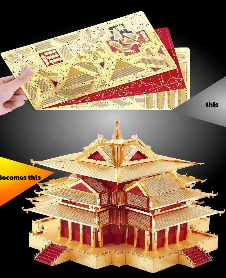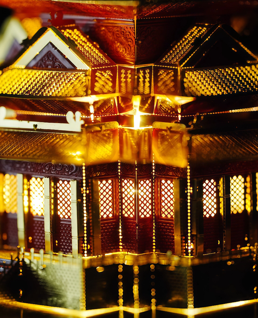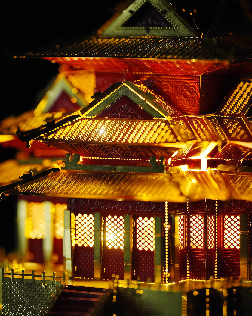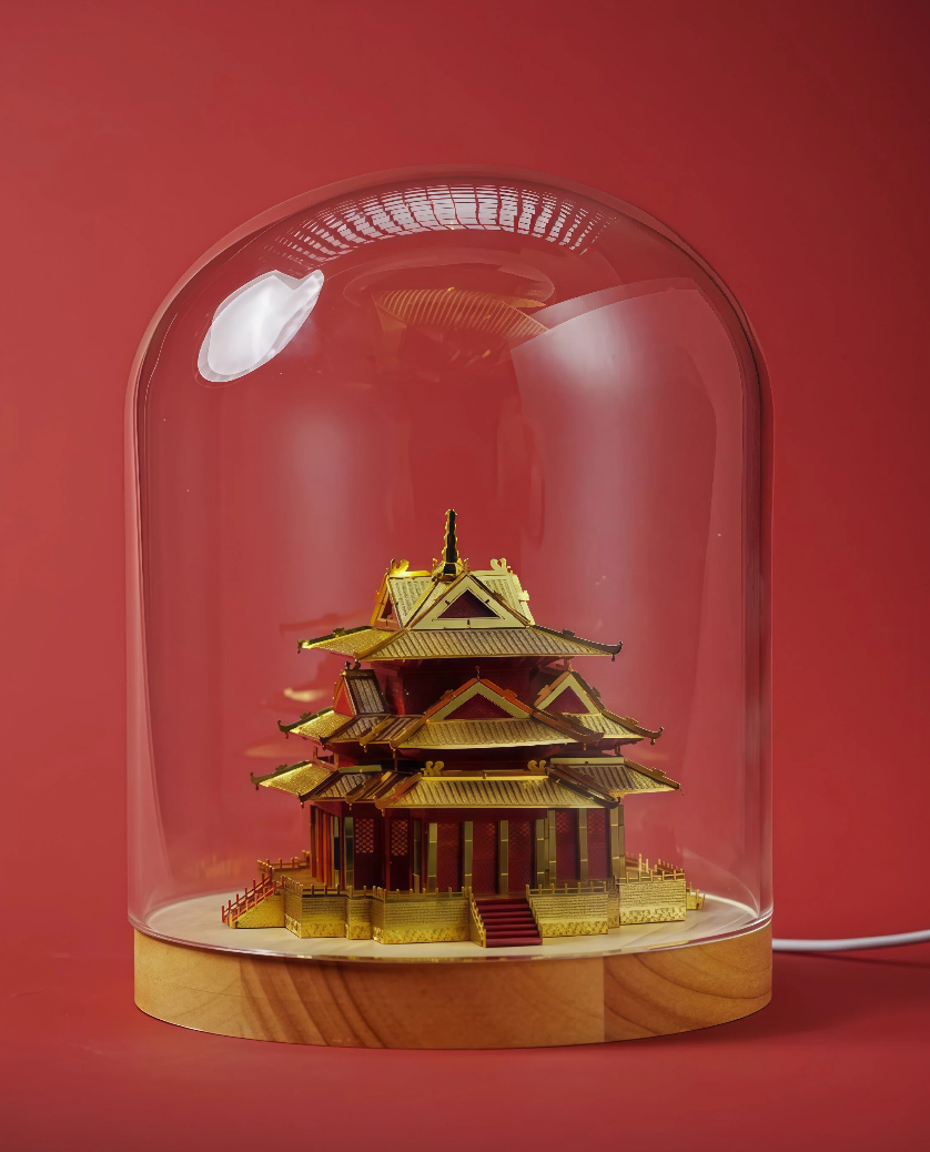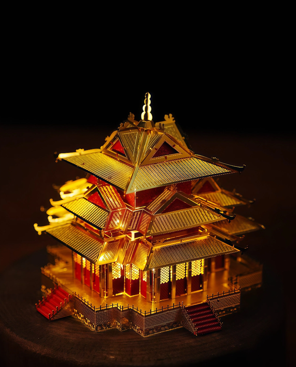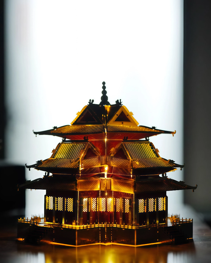 This product is an assembly model (equipped with a display cover/light base) replicating the Forbidden City’s corner tower, restoring its iconic features like multi-layered eaves and red walls with golden tiles. The Forbidden City’s corner tower is a classic structure of the Ming and Qing imperial palaces, renowned for its exquisite wooden architecture craftsmanship—it represents traditional architectural art and carries Chinese aesthetics and cultural connotations. This model allows users to enjoy the fun of hands-on assembly, and when paired with the display cover/light base, the finished product can serve as a decorative ornament that combines cultural charm and aesthetic value for space embellishment.