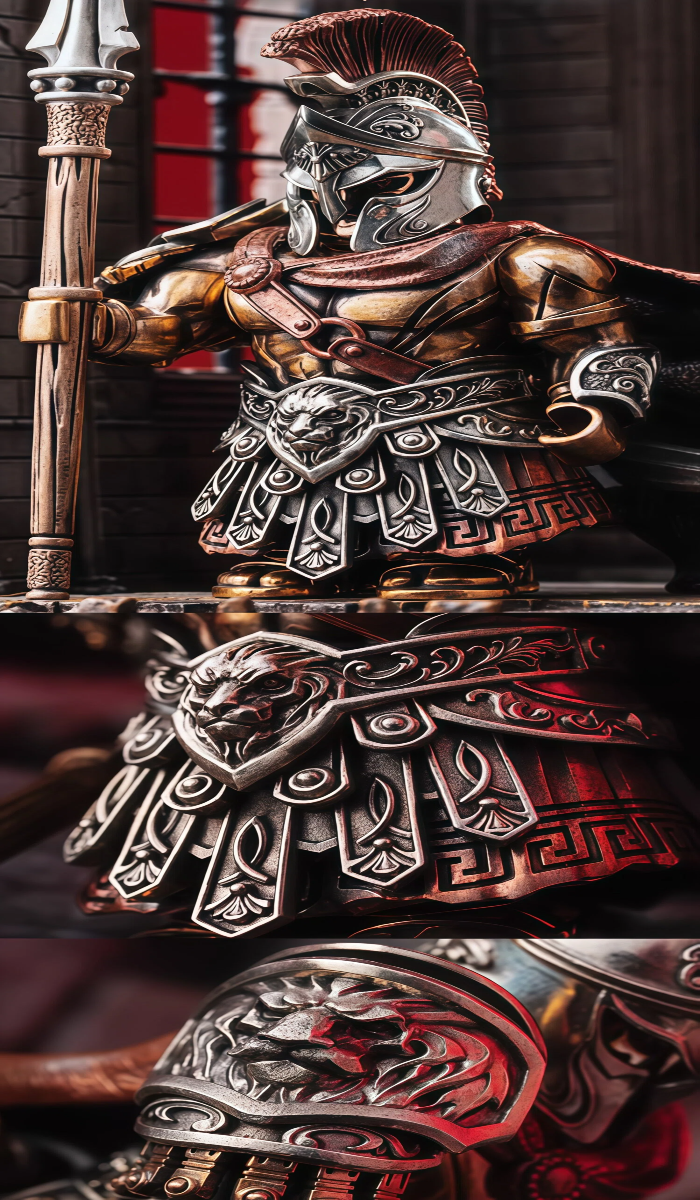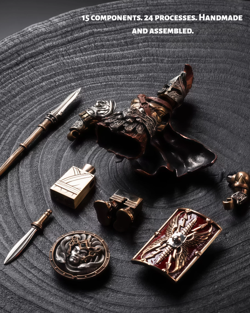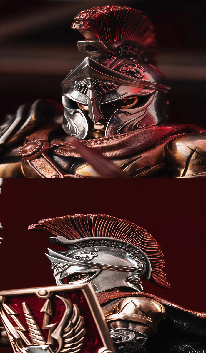The iconic crest-shaped plume features a reddish-bronze metallic finish, adorned with delicate scrollwork and geometric engravings. It not only recreates the signature look of a Spartan warrior but also conveys the weight of battlefield experience through layered metal aging techniques.